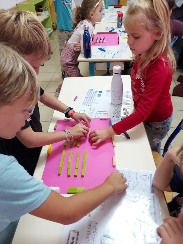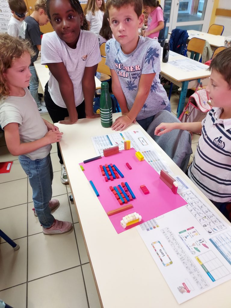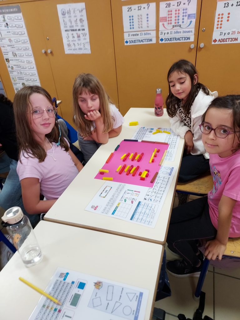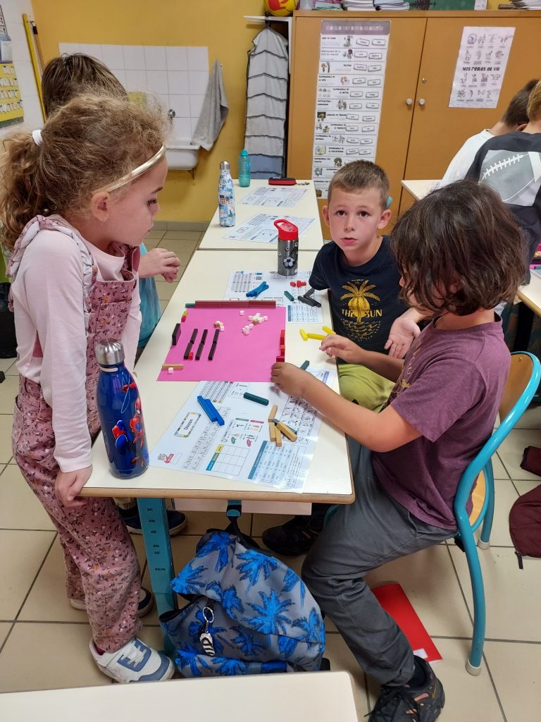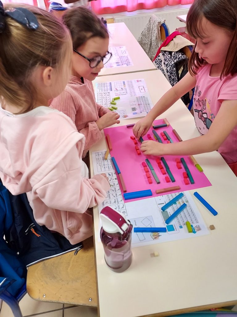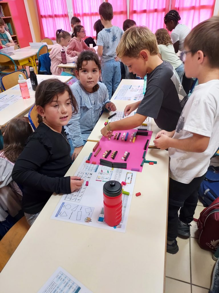 Nous avons commencé par observer et situer les différents meubles présents dans la classe puis nous avons travaillé avec des barres et des cubes pour les replacer sur une feuille. Ensuite, nous avons tracé sur une fiche le plan de la classe. Nous avons terminé par faire ensemble le plan de l’école ce qui nous a permis de découvrir la nouvelle implantation des classes.