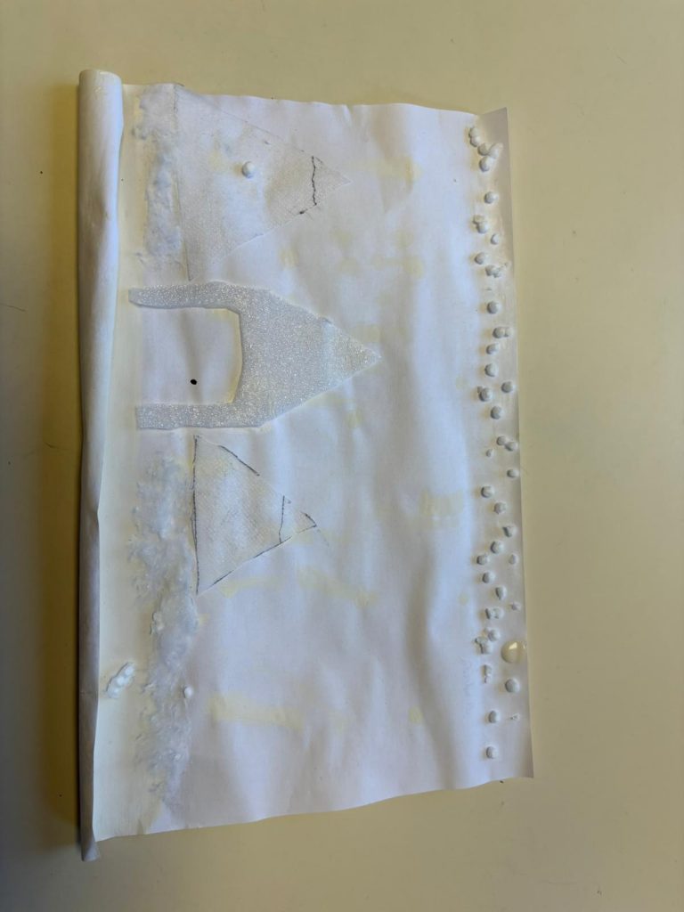 Privés de couleurs, les élèves ont découvert l’importance du relief et des textures. Papier froissé, superpositions, découpages, collages, pliages… Ils ont exploré différentes techniques pour donner de la profondeur à leurs œuvres. Les sapins se distinguent par des jeux d’épaisseurs, la neige semble tourbillonner grâce aux matières variées, et d’autres éléments sont reconnaissables grâce au relief.